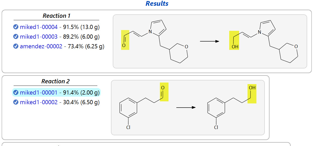 - Scale: Filter the search results by the experiment scale, in grams. As a rule of thumb, the larger the experiment scale, the more reproducible the yield.