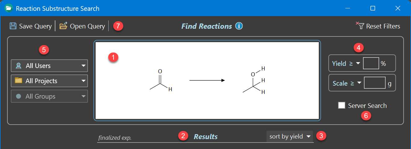 A reaction substructure search lets you find experiments involving a specific reaction, say the reduction of an aldehyde to a primary alcohol, as an example. The search is initiated by drawing a reaction sketch containing only of the smallest possible fragments of reactant and product which actually do change during the reaction. To increase the selectivity of the query, relevant substituents surrounding the reactive centers may additionally be specified, if required.