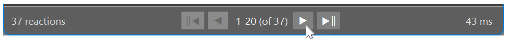 The search results are presented in result pages containing at most 20 reactions. The navigation panel at the bottom of the result list lets you navigate through subsequent and previous result pages, if more than 20 hits were found. In this case, the first result page contains the most relevant matches, depending on the specified sort type ❸ (by yield or scale). Subsequent pages contain results with decreasing relevance.